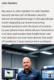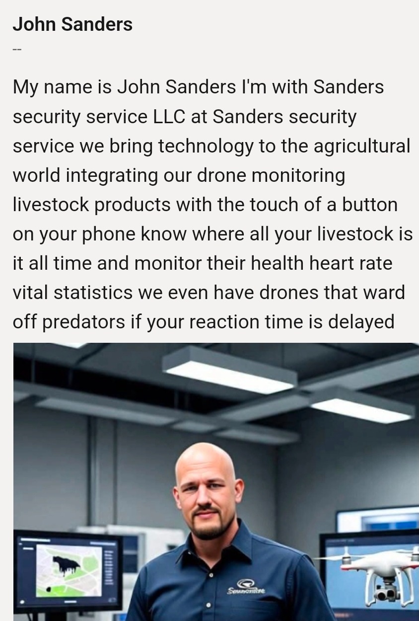 I am the founder of Sanders Security Service LLC I have invaded the way ranchers can monitor livestock by my drone and real-time system app